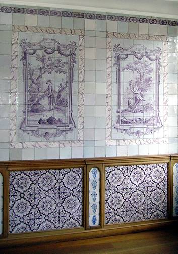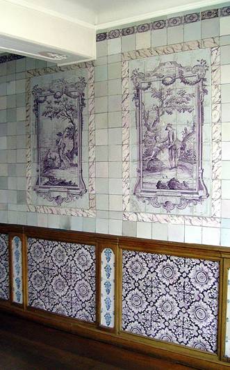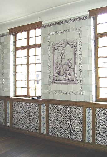 Im oberen Raum bestechen vom Rotterdamer Fayencemaler Jan Aalmis (1) signierte Darstellungen der vier Jahreszeiten in äußerst präziser Fayencemalerei. Die Fliesenbilder in manganvioletter Inglasurmalerei, umrahmt von marmorierten Teilfliesen, geben dem Raum ein besonderes Flair.