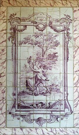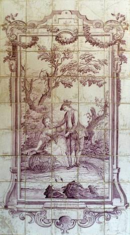 101 Tableau en carrelage, représentant une pastorale, décor manganèse. Haut. 1m70; larg. 0m90
