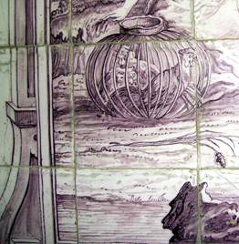102 Tableau en carrelage, représentant la cueillette des pommes, décor manganèse. Haut. 1m70; larg. 1m05. Dieses Fliesenbild war im Katalog abgebildet: