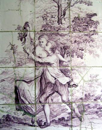 Die Allegorie des Herbstes zeigt ein junges Mädchen, das einen Hut mit Weintrauben hochhält. Ein junger Mann greift in stürmischer Umarmung nach beidem. Das Bild aus 9 x 5 Fliesen hat mit integrierter Rahmung die Maße 119 x 66 cm.