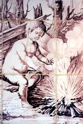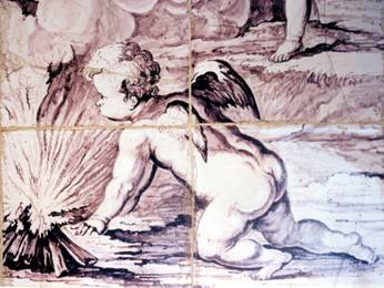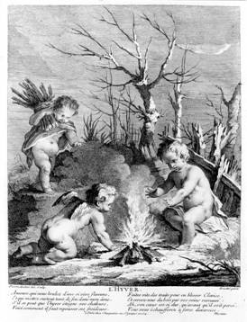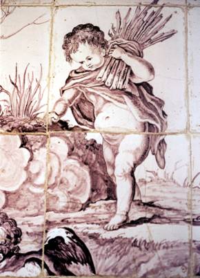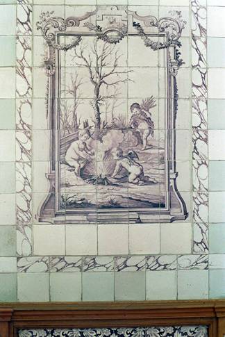 Die Allegorie des Winters zeigt Putti am wärmenden Feuer. Das Bild ist mit 7 x 5 Fliesen und 106 x 66 cm um eine Reihe Fliesen kürzer als die Allegorien von Frühling, Sommer und Herbst. Dies resultiert daraus, dass dieses Fliesenbild speziell für eine Schürze über einem offenen Kamin gefertigt wurde.