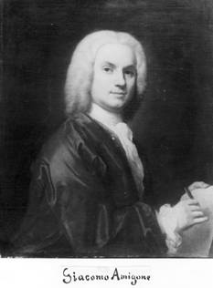 (5) Giacomo Amigone (Jacopo Amiconi) (* 1675 Venedig - + 1752 Madrid), Radierer, Frescant, Altar- und Bildnismaler. Ausgebildet in Venedig und Flandern, tätig in Bayern, Oberschwaben, London, Venedig und für den spanischen Hof. Besonders bekannt wurde er als Dekorationsmaler beim Ausmalen des Schlosses Schleissheim bei München, ab 1729 in London Portraitmaler der vornehmen Gesellschaft, ab 1747 Hofmaler in Madrid. Für die Verbreitung seiner Werke sorgte er eigenhändig durch Schaffung von Radierungen. Sein Schüler Joseph Wagner trug erheblich zur Verbreitung seiner Arbeiten bei.