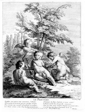 Für die Allegorien „Frühling“, „Sommer“ und „Herbst“ dienten graphische Blätter von Joseph Wagner, Venezia (4) nach Giacomo Amigone (Jacopo Amiconi) (5) als Vorlagen und für die Allegorie „Winter“ ein Blatt des Pierre Alexandre Aveline II (6) nach François Boucher (7).