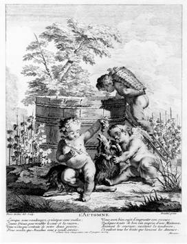 Die Darstellung entspricht dem Blatt Septembre der Stichfolge ‚Die zwölf Monate’ von Johann Esaias Nilson aus dem Jahre 1766, die Rahmung dem Blatt Augustus. Es ist allerdings richtig das Sternzeichen Waage für September eingefügt. Diese Abbildung entnahm ich dem Versteigerungskatalog Antoine Terme.