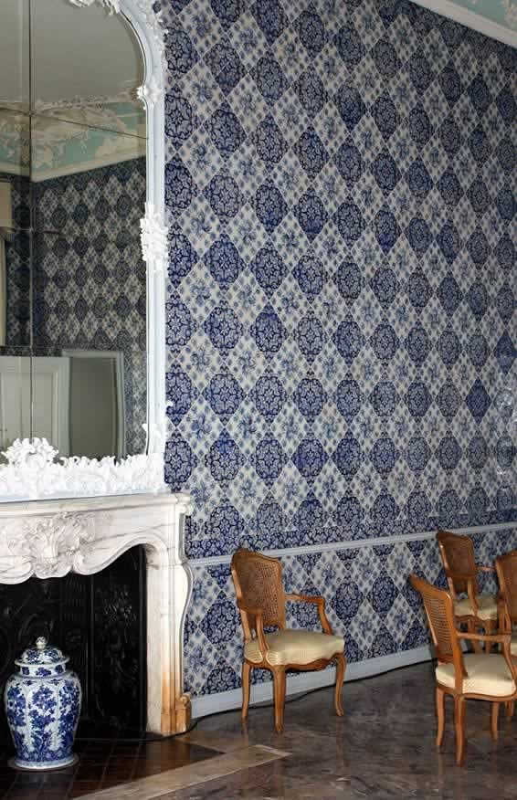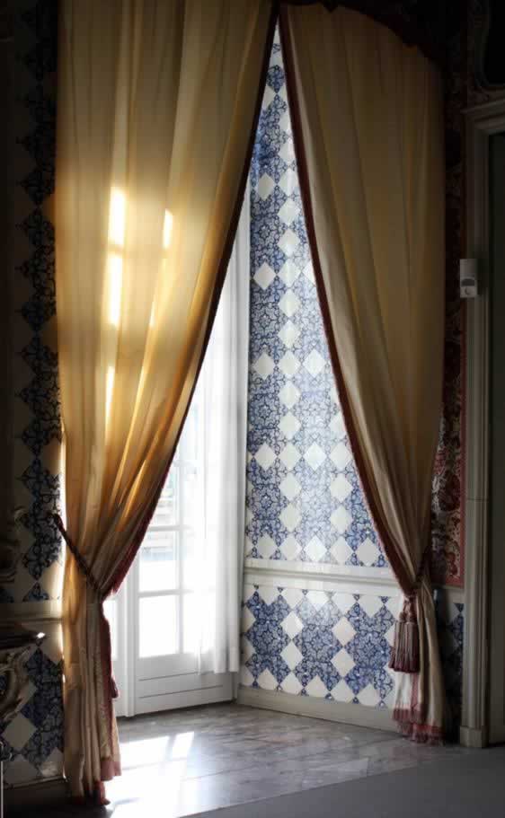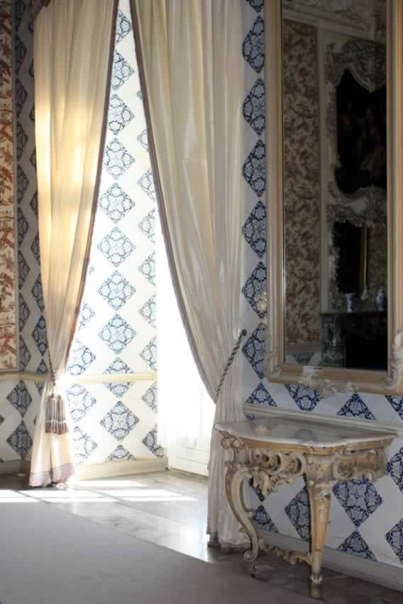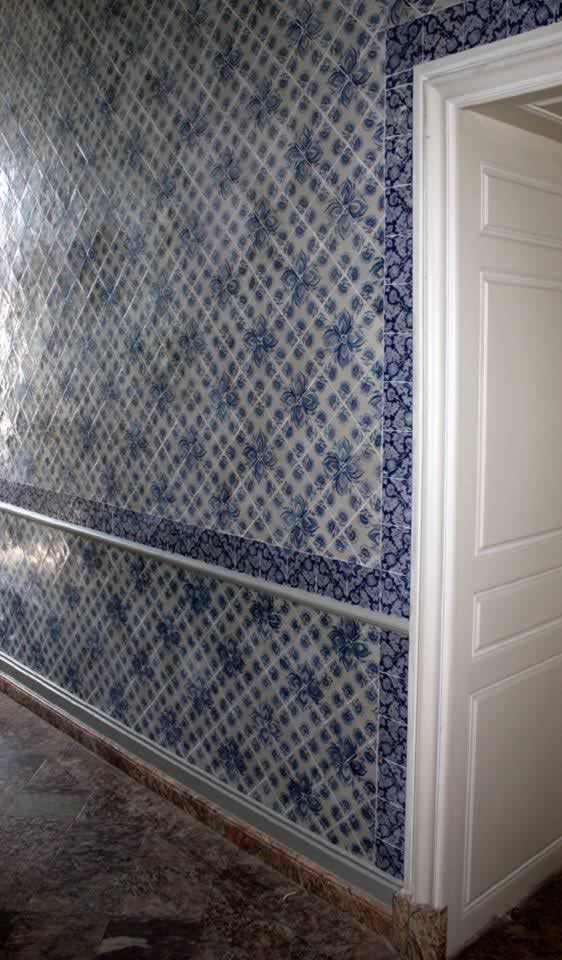 Die Fliesenbekleidung der Sockel- und Fensterbereiche wurde aus Dekorfliesen der Art >Kievitseitjes< im Wechsel mit uni weißen Fayencefliesen erbracht. Als neue Spielart der Dekoration sind im Audienzsaal jeweils acht Dekorfliesen in diagonaler Anordnung zu einem Muster zusammengefügt.