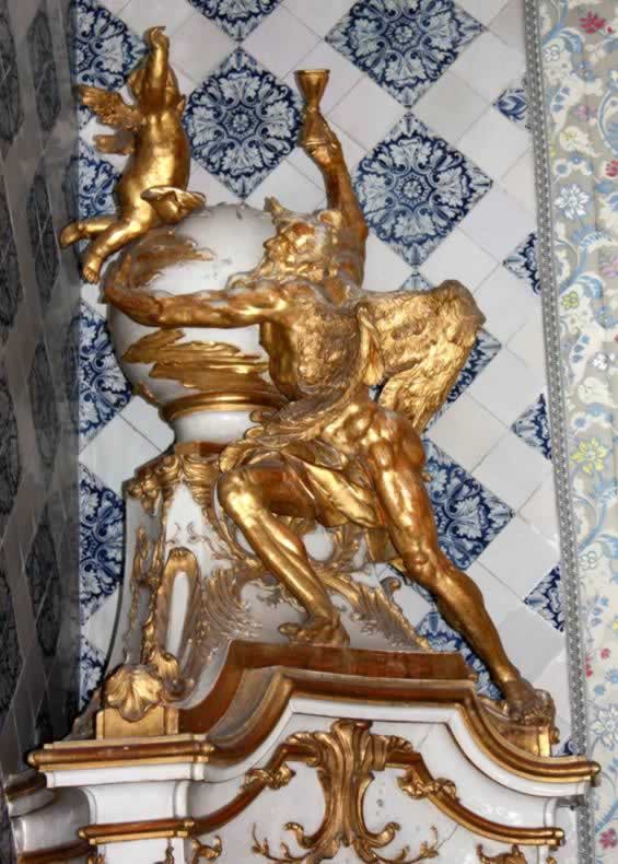 Der Zeitgott Saturn mit Stundenglas und Weltkugel ist das markanteste Motiv des weiß glasierten und vergoldeten Prunkofens. Auf der Weltkugel kniet ein Putto und deutet an, das alles Irdische vergänglich ist.