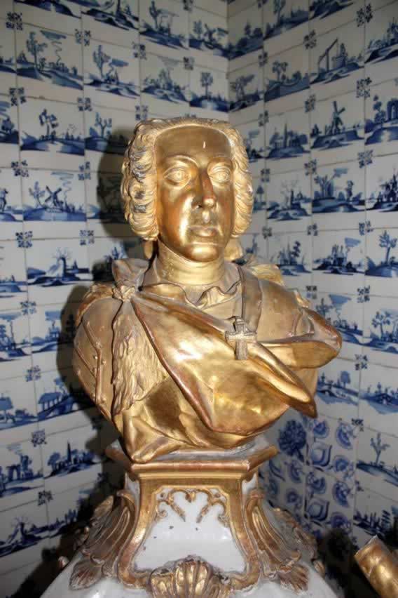 Eine vergoldete Portraitbüste Clemens Augusts bekrönt den Fayenceofen.