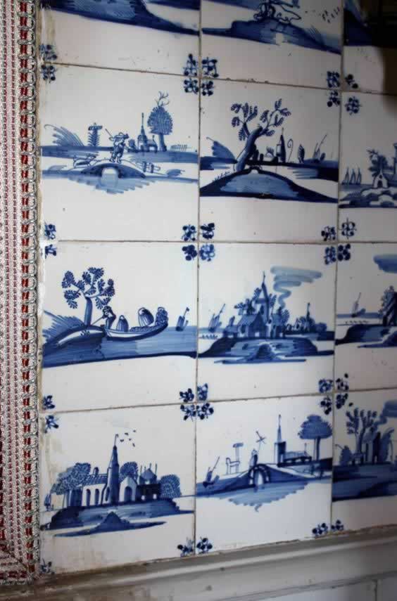In den Räumen 4, 5 und 7-11 wurden drei verschiedene Rotterdamer weiß-blaue Dekorfliesen und uni weiße Fliesen, dazu im zweiten Vorzimmer (Raum 8) Utrechter Landschaftsfliesen verarbeitet. Die Dekore sind im Rotterdamer Musterbuch als Nummern 32, 61 und 90 enthalten. Die Nummer 61 ist Vorlage für eine Fliese mit manganfarbener Bemalung.