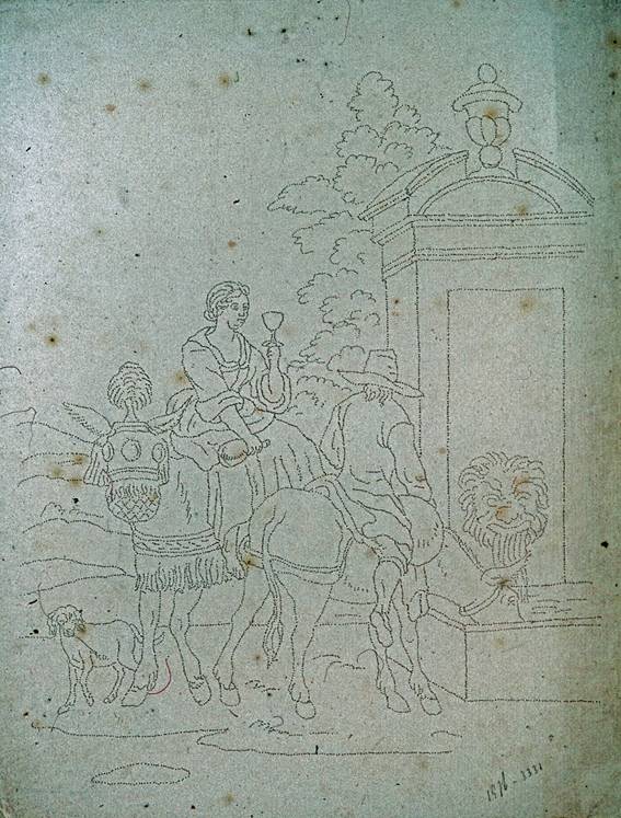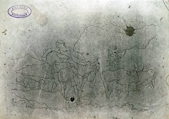 Ca. 260 x 200 mm, pen in bruin over potloodschets, doorgeprikt.