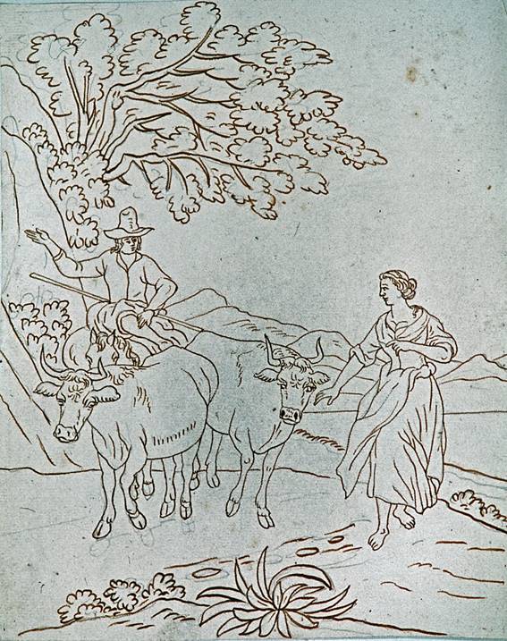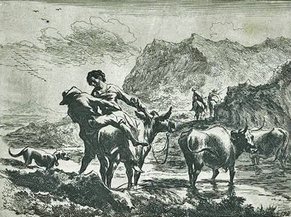 Op de voorgrond steekt een jonge vrouw via stenen een rivier over. Een herder te paard volgt haar, en een gedeelte van het vee staat in de rivier.