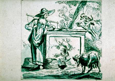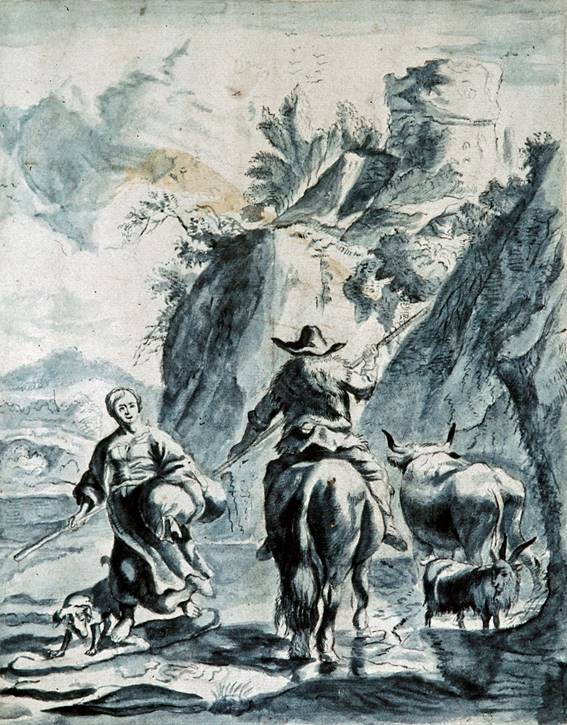 Een herderin en een herder laten hun vee drinken, Op de achtergrond trekken andere herders met hun vee voorbij.