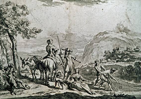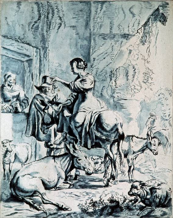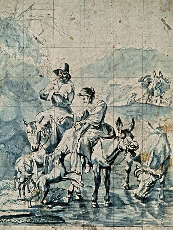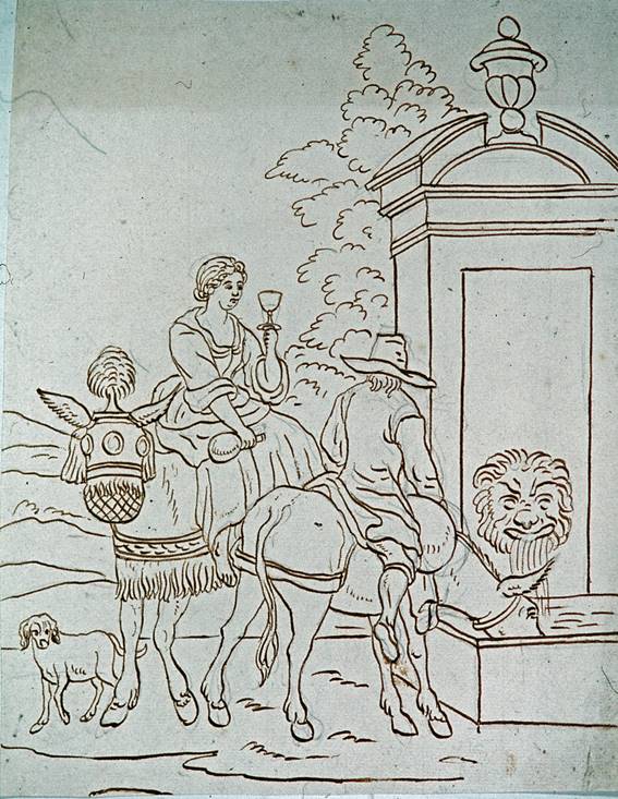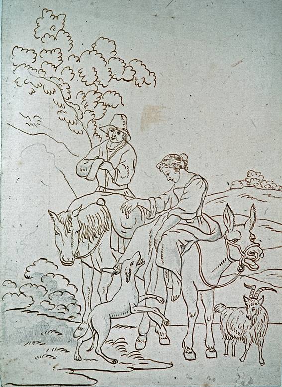 In een heuvelachtig landschap pauseert een groep reizigers, waarvan er drie op een ezel zitten, bij een fontein. Bij de fontein staan ook twee wasvrouwen. Rechts besnuffelt een hond een andere hond.