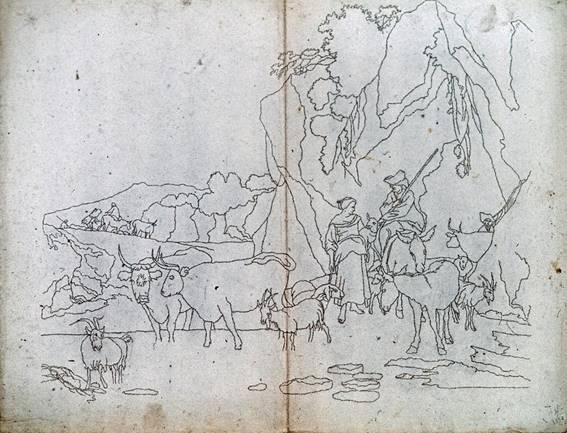 Op de voorgrond een herder te paard in gesprek met een herderin. De jonge herder die naast de ruiter staat drijft twee schapen en een geit over de weg.