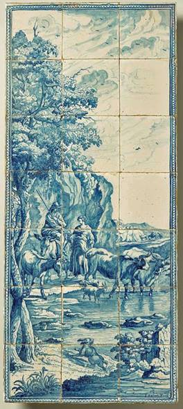 Tegeltableau van eenentwintig tegels (7 x 3) met een blauw geschilderde pastorale voorstelling van een herderspaar met hun vee bij een plas. Links twee bomen en op de voorgrond een hond. Rechts onder, de signatuur: I. Aalmis P. 1778.