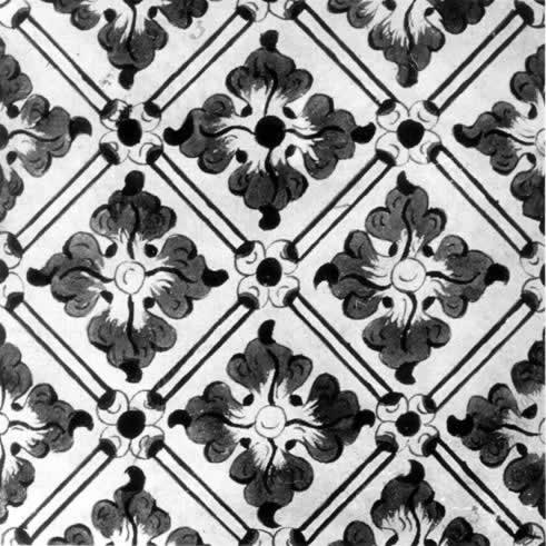 Unter den Zentralmotiven befindet sich jeweils eine weitere in Blau gemalte Kartusche (2x3 Fliesen) mit Rocaillerahmen und einer schildartigen Fläche, die aus diagonal angeordneten, auf die Spitze gestellten Quadraten gebildet wird. Kreuzblüten füllen die Quadrate aus und mildern die geometrisch strenge Wirkung. Dieses Dekor trägt die Bezeichnung »bloemruitjes« und wird im Musterbuch der Rotterdamer Fliesenhersteller, das im Gemeindearchiv der Stadt bewahrt wird, unter der Nr. 3 geführt (Abb. 3).