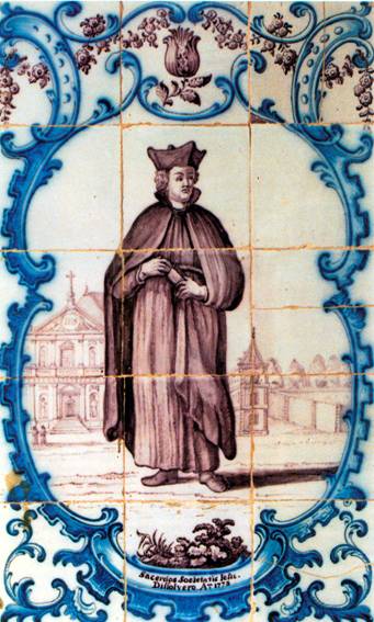 Die Reihenfolge der Abbildungen entspricht der Anordnung der Fliesenbilder in der Kapelle, ausgehend von der Evangelienseite. Der Kupferstich ist mit dem Buchstaben a versehen, die entsprechende Durchstaubschablone oder Vorlagenzeichnung mit b und das zugehörige Fliesenbild mit c. Besonderheiten und Unterschiede zwischen Stich, Zeichnung und Fliese werden unter den einzelnen Abbildungen erläutert. Für die bei Simões abgebildeten aber inzwischen verschollenen Fliesenbilder mit den Darstellungen des Unbeschuhten Karmeliters und des Hieronymiten konnten die Vorlagen ermittelt werden (Abb. 39a, b und 40a, b).(22) Die deutschsprachigen Bildunterschriften der Stiche wurden unverändert entnommen aus: »Kurtze und gründliche Histori...« Augsburg, 1702.