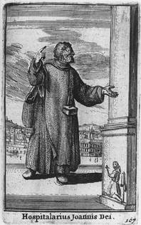 Abb. 5 Titelblatt von >>Histoire des Ordres Religieux<<. Stecher Adriaan SchoonebeekNur die Abbildungen Nr. 21 a und 33a sind der deutschen Ausgabe entnommen, da die in der französischen nicht mit den Fliesenbildern korrespondieren. Darüber hinaus ist in den einschlägigen Lexika noch eine Ausgabe in russischer Sprache verzeichnet. Möglicherweise haben die Fliesenmaler jedoch ein uns unbekanntes, späteres Werk oder gar das eines Kopisten als Vorlage genutzt, da in keiner der genannten Ausgaben Darstellungen des Cardinalis Purpuratus Pater, des Romanus Pontifex, des Episcopus und des Dominicanus enthalten sind. Zweifellos muss allerdings Simões' Angabe korrigiert werden, die Vorlagen für die Fliesenbilder seien in dem zweibändigen Werk des Jesuitenpaters Filippo Bonani zu finden.(20) Erstaunlicherweise ist im Krankenhaus kein Fliesenbild mit der Darstellung des Namensgebers bzw. des Ordens der Barmherzigen Brüder vom hl. Johannes von Gott vorhanden und wird in der älteren Literatur auch nicht erwähnt, obwohl Schoonebek den»Hospitalaris Joannis Dei« gestochen hat (Abb. 6).