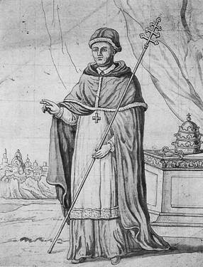 1c Romanus Pontifex. Der Papst hält in der linken Hand ein dreibalkiges Papstkreuz;