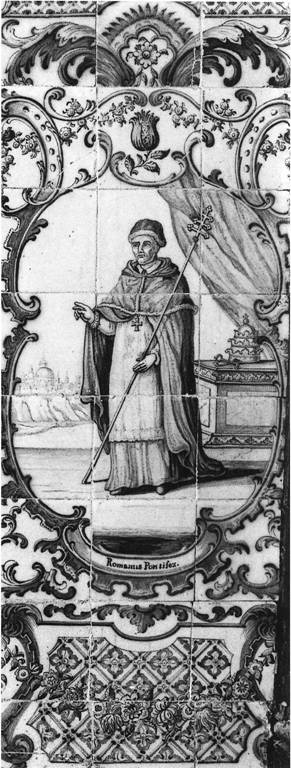 Abb. 2 Fliesenbilder in der Kapelle des Hospitals San Juan de Dios, 1773/1775, Manufaktur Aalmis, RotterdamDie Kapelle bestand schon 1707 und diente als Sakramentskapelle für die Patienten des Krankenhauses. An den Wänden der Evangelien- und der Epistelseite sind 36 Tableaux von je drei Fliesen Breite als Fries angesetzt, der insgesamt 8 Fliesen hoch ist. Rechts und links neben der Tür befindet sich jeweils ein weiteres Tableau. Die einzelnen Fliesen weisen das typisch niederländische Format von 130 x 130 mm auf. Der Scherben ist ca. 7 mm dick, der Glasurauftrag glatt und dicht. In der zentralen inneren Fläche jeder Kartusche (5x3 Fliesen) ist ein Mönch oder geistlicher Würdenträger dargestellt, in einem für seinen Orden oder seine kirchliche Stellung typischen Gewand vor einer zart nuanciert gemalten Landschaft oder einem Bauwerk.