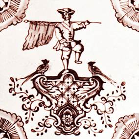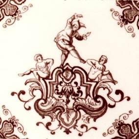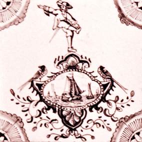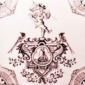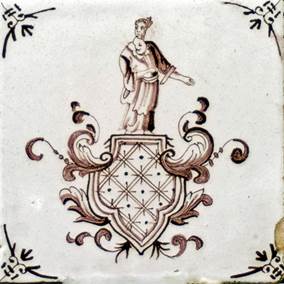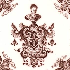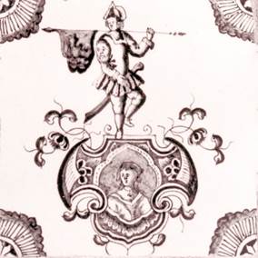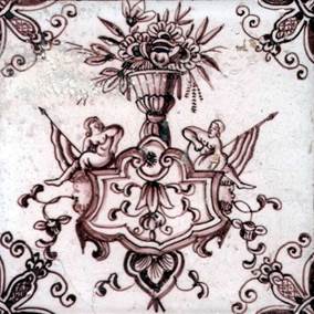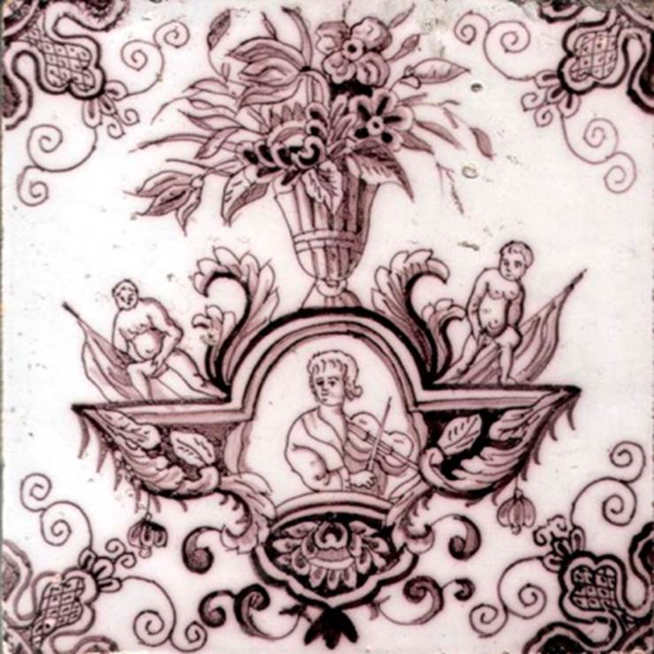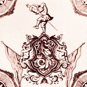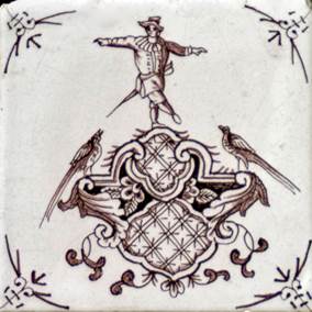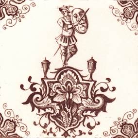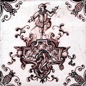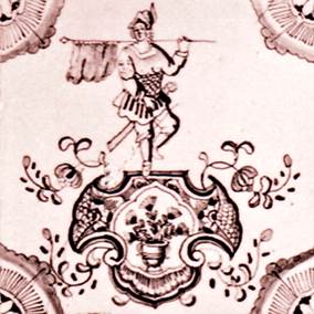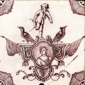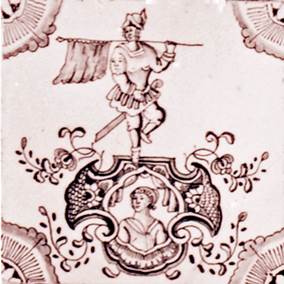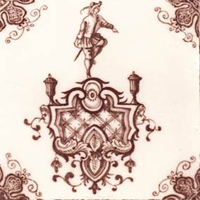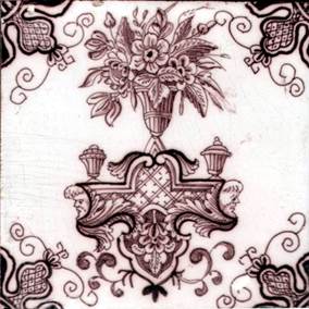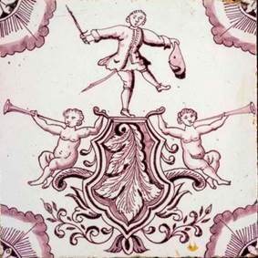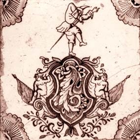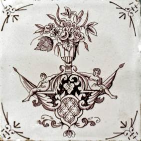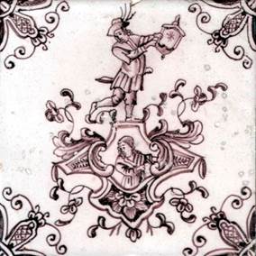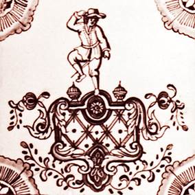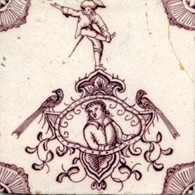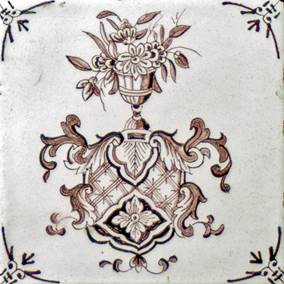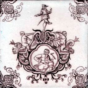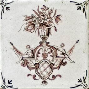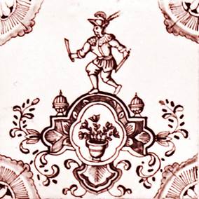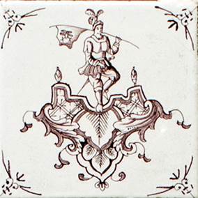 11. Kunstenmaker op cartouche, paars, hoekmotief: