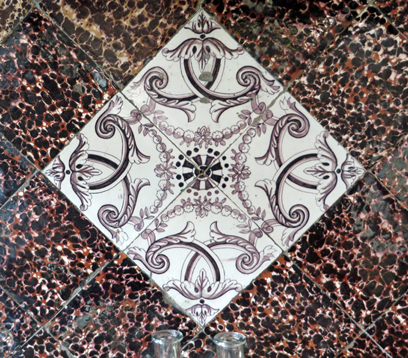 Als Blickfang wurde ein Feld von vier Fliesen der Art ‘gebloemde beugel‘ in das Feld der Schildpattfliesen eingearbeitet.