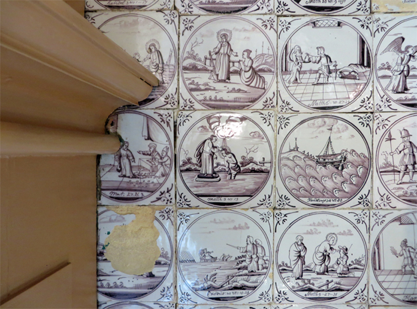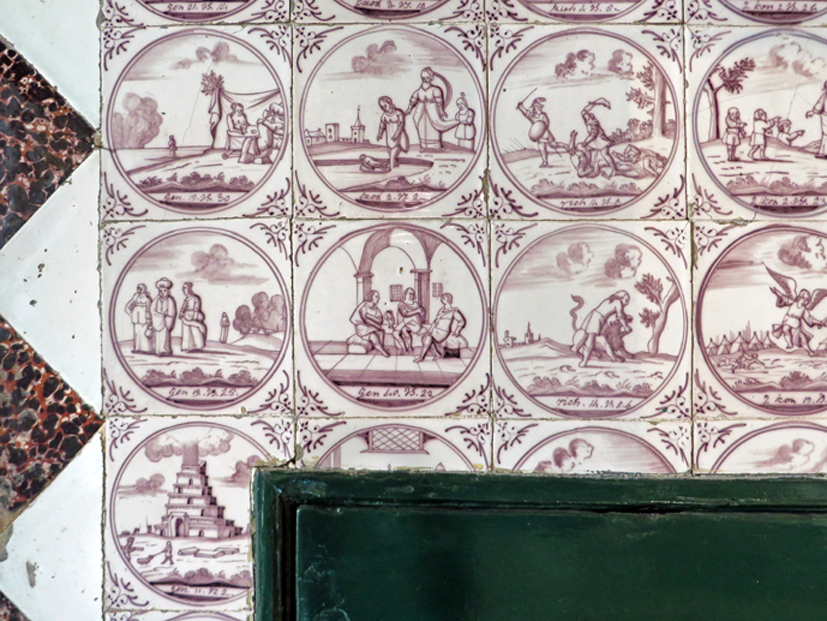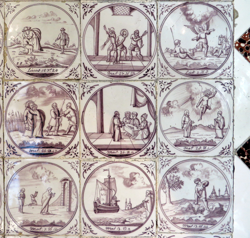 Die Bibelfliesen ohne Text können der Werkstatt 'Het Wapen van Dantzich' an der Hoogstraat zugeschrieben werden. Ludolf Bakhuijzen war zu dieser Zeit Eigentümer .