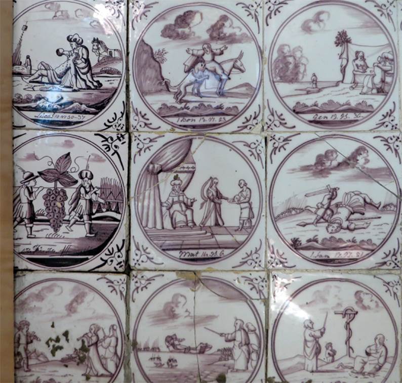 De bijbeltegels zonder tekst kunnen de tegelbakkerij 'Het Wapen van Dantzich' aan de Hoogstraat worden toegeschreven. Ludolf Bakhuijzen was om deze tijd de eigenaar.