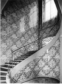 Die einläufige Eichenholztreppe, von einem Ziergitter aus Schmiedeeisen begleitet, führt durch einen annähernd zehn Meter hohen, im Grundriss rechteckigen Raum, der vom Boden bis zur Decke mit ca. 10.000 Fliesen in blauer Inglasurmalerei auf weißem Grund bekleidet wurde.(3) Unter Treppenlauf und Podest ist die Fliesendekoration auf den Fond gemalt (1970 durch die Restaurierungswerkstatt II des Rheinischen Amtes für Denkmalpflege aufgedeckt und restauriert).