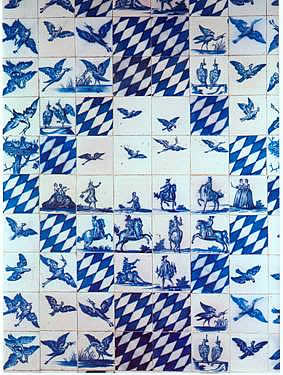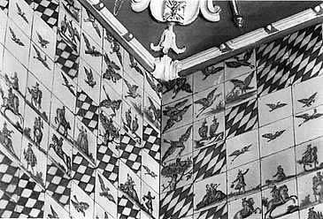 Auch der untere Salon ist mit Wandfliesen ausgestattet. Sie sind ebenfalls in den Farben Weiß und Blau gehalten; schöne Fliesenbilder spielen auf die Falkenjagd, Initialkartuschen auf den Bau- und Jagdherrn an.