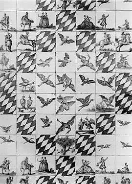 Der Fliesenauftrag für Falkenlust ist bezüglich Umfang und Qualität der Falkenjagdmotive unübertroffen geblieben. In Deutschland lässt sich wenig mit ihm vergleichen. Aus dem Markgräflichen Jagdschloss Gunzenhausen stammt eine „Falkenjagd auf Fliesen", heute im Städtischen Museum Gunzenhausen.(46) Es handelt sich um manganfarbene Fayencefliesen, die der „Porcellainer" Johann Georg Weiß, Fayencemanufakturbesitzer in Crailsheim, für den Markgrafen Carl Wilhelm Friedrich von Brandenburg-Ansbach verfertigte und 1754 lieferte.(47) Im Unterschied zu den Fliesen in Falkenlust, die in Ansbach bekannt waren,(48) zeigt jede der Gunzenhausener Fayencefliesen ein in sich geschlossenes Bild mit einer Landschaft, in der die Falkenjagdszene spielt. Die Fliesenbilder erscheinen volkskunsthaft naiv; aber darin liegt ihr besonderer Charme. Einige Szenen folgen Gemälden: so der Falkenjunge mit den Falken auf der Trage einem Ölbild des ansbachischen Kammermalers Christoph Anton Hirsch von 1752 im Kreis- und Stadtmuseum Ansbach.(49)