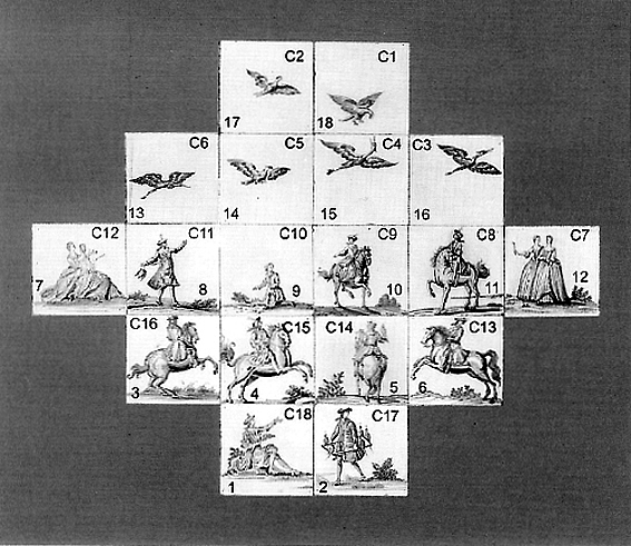 Mit C1-C18 bezeichnete die Manufaktur die Fliesen auf der RückseiteDie Motivgruppe in Form der Querraute setzt sich aus folgenden Einzelmotiven zusammen, angeordnet in fünf von unten nach oben zu lesenden Reihen, beginnend jeweils links: