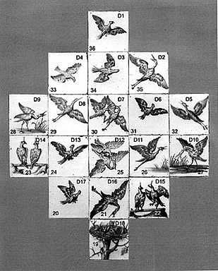 Mit D1-D18 bezeichnete die Manufaktur die Fliesen auf der Rückseite.In gleicher Betrachtungsweise von unten nach oben folgen die Darstellungen der Motivgruppe in Form der hochgestellten, sechsreihigen Raute: