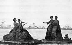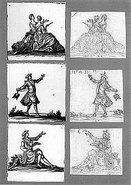 Diese Landschaftsveduten mit den Kollagen sind zweifellos Liebhaberarbeiten aus der Fliesenmanufaktur, jedenfalls vor der Mitte des 19. Jahrhunderts aufgrund des Hadernpapiers(27) entstanden, auf das die Vorlagen geklebt sind. Nachdem der Auftrag für Falkenlust ausgeführt war, hatten die Vorlagen ihren Zweck erfüllt. Ein Fliesenmaler erkannte die Qualität in Erfindung und Komposition, schnitt die Motive aus und setzte sie neu zusammen; - dann malte er oder ein anderer die Landschaft um die Figuren herum. Auf diese Weise blieben die Vorlagen erhalten. Sie wurden im Februar 1960 aus den Beständen des Museums Boymans - van Beuningen, Rotterdam, dem Archiv dieser Stadt übergeben.(28)