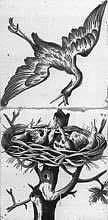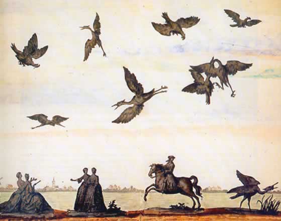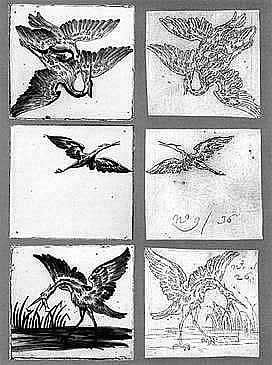 19. Reiherhorst mit Jungvögeln, denen sich der Reiher (21) im Fluge nähert und dem sie die aufgerissenen Schnäbel entgegenstrecken. 20. Fliegender Falke nach rechts mit erhobenem Kopf nach links. 21. Fliegender Reiher mit Fisch im Schnabel, sich den Jungreihern (19) nähernd. 22. Zwei Falken auf der Reck, der rechte aufflatternd, mit Hauben; darauf das Monogramm CA. 23. Zwei Falken auf der Reck, mit Hauben; darauf das Monogramm CA. 24. Fliegender Falke nach rechts. 25. Ein Falke greift einen Reiher in der Luft von oben links an. 26. Fliegender Reiher nach rechts mit Fisch im Schnabel. 27. Reiher nach links im Schilf, einen Fisch im Schnabel. - 28. Reiher nach rechts im Schilf mit Fisch im Schnabel. 29. Fliegender Reiher nach rechts. 30. Falke, einen Reiher in der Luft von links angreifend. 31. Fliegender Falke nach rechts, den Kopf nach oben links gewendet. 32. Fliegender Reiher nach links. 33. Fliegender Falke, nach rechts unten stoßend. 34. Fliegender Falke nach rechts, auf den Reiher (35) zustoßend. 35. Fliegender Reiher nach rechts, den Kopf zum angreifenden Falken (34) gewendet. 36. Fliegender Falke nach rechts.