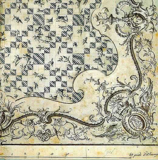 Der sorgfältig mit kleinsten Details gezeichnete und lavierte Entwurf,(23) nach graphologischen und stilistischen Kriterien Stephan Laurenz de la Rocque zuzuschreiben, zeigt außer dem Deckenkehlenstuck den Plafondspiegel in einem früheren Planungszustand: Hier bereits erscheint das Dekorationssystem mit dem Netz aus Rautenfliesen und den eingeschlossenen Bildmotiven zu jeweils 18 Fliesen in quer- und hochformatigen Rhombenfeldern. Anders als in der späteren Fliesendekoration der Wände enthält nicht jede Fliese ein Bildmotiv, sondern die Figuren und Vögel innerhalb des Rautennetzes beanspruchen stets mehrere Fliesen; hierbei können einzelne Fliesen weiß bleiben.