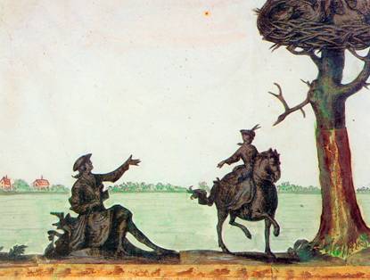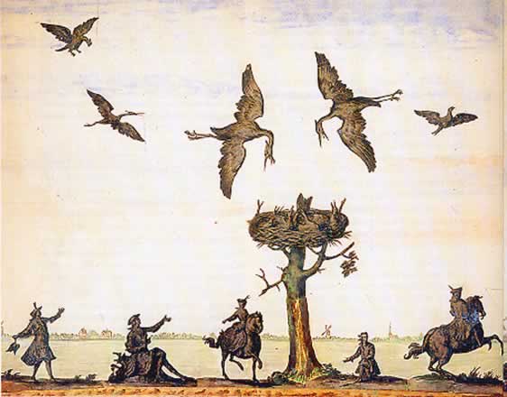 Rotterdam, Gemeentearchief (3392).Blatt 339225 zeigt in der Erdzone des Vordergrundes von links den Falkner mit dem Federspiel (8), den sitzenden Falkner (1), die Falknerin zu Pferd (10), den knienden Falkenjungen mit den Fischen (9) und den nach rechts reitenden Falkner in Rückenansicht (3). Zwischen der Falknerin und dem Falkenjungen ist ein Baumstamm gemalt, der sich fortsetzt in der Baumkrone mit dem Reiherhorst (19). Den Jungvögeln im Nest nähern sich aus den Lüften die Reiher 21 und 35. Den Himmel beleben ferner die Falken 17 und 18: Sie greifen den fliegenden Reiher 16 an.