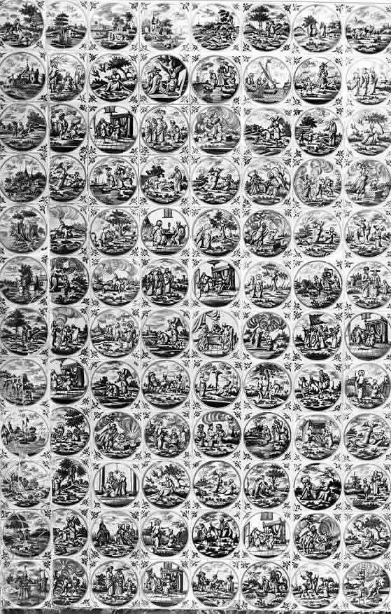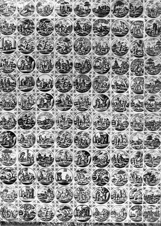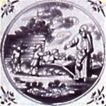 Bibelfliesen in manganbraun, umgeben von Landschafts- und Hirtenfliesen in blauer Bemalung