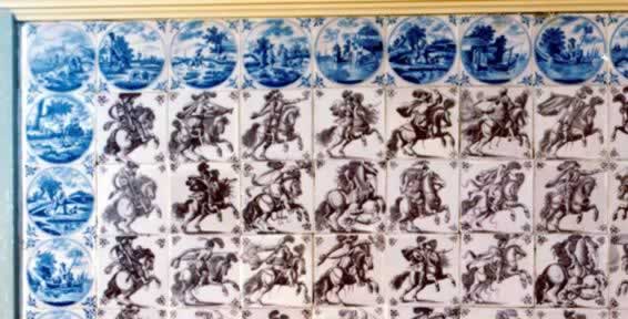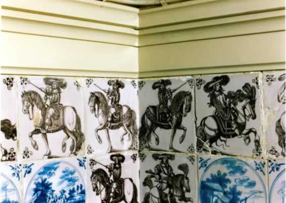 Salon 1 Landschafts- und Hirtenfliesen in blauer Bemalung umrahmen manganfarbene Reiterfliesen
