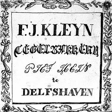 On 19 February 1845 FJ Kleyn married Catharina Maria Theresia Hopman who was a descendant of Jan Aalmis. Kleyn left Van Traa's employment in 1850. His last salary was paid on 21 August 1850. On l January 1851 he was living in Delfshaven at Schoonderloo 71. His occupation was given as 'manufacturer'. He put the experience he had gained at the tile workshop De Bloempot to use and registered a tile workshop of his own. On 31 December 1859 he was registered as a tile manufacturer and lived at Schoonderloo E 68K (later D102) in Delfshaven.