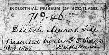 In 1861 F J Kleyn of Delfshaven, near Rotterdam, donated 42 tiles to the Royal Scottish Museum (then called the Industrial Museum of Scotland) in Edinburgh. Each tile bears on the reverse a paper sticker with the following inscription: