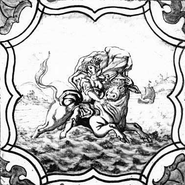Tile from the F J Kleyn workshop with a mythological scene depicting the Rape of Europa. The Greek god Zeus in the guise of a bull carries her across the Bosperus.