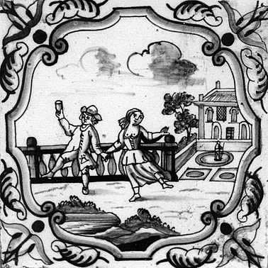 Tile from the F J Kleyn workshop with two figures dancing in the garden of a country house. This kind of scene is also found on 18th century tiles made in Rotterdam.