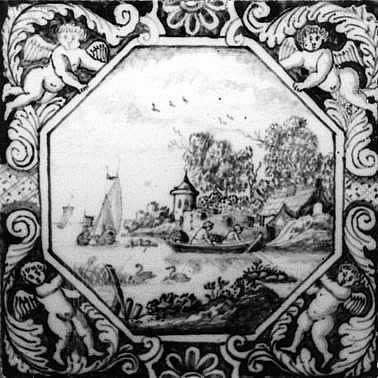 Tile from the F J Kleyn workshop with a river scene and finely painted cherub corners.