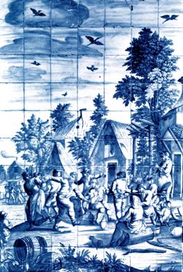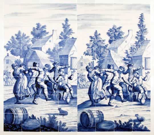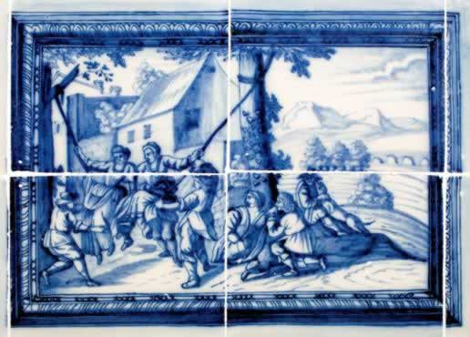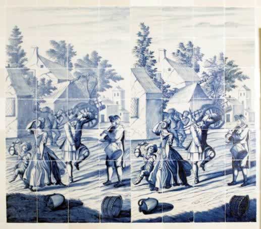 Interessante Fliesenmalereien des Sommerspeisesaals bezüglich des graphischen Vorbildes sind die beiden fast identischen Szenen mit den tanzenden Bauern (Abb. 14). Markanteste Differenz ist die Position der lauernden Katze im Fliesenbild.