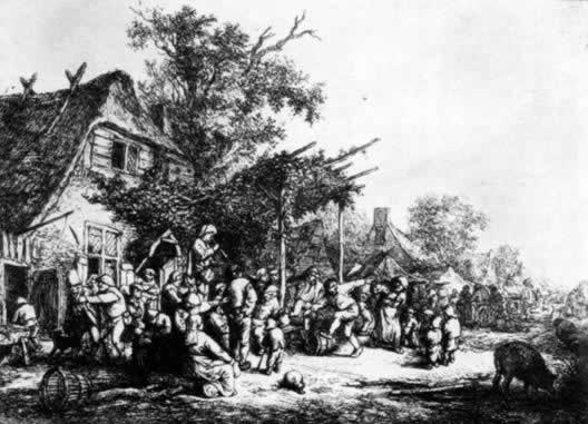 Adriaen van Ostade, „Tanz unter der Weinlaube“. Radierung ca. 1652