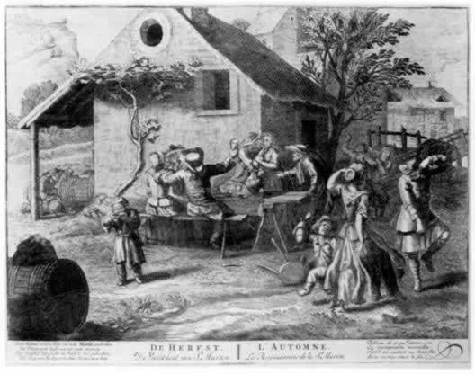 Auch für diese Szene habe ich die Graphik ermittelt, auf der die Fliesenszene zum größten Teil beruht. Es ist die Darstellung des Herbstes aus einem Jahreszeitenzyklus, radiert und gestochen von Gerrit de Broen (12), Kupferstecher in Amsterdam.