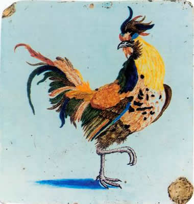 afb.6) Haan naar een kleurenprent van Johan Teyler, tegelplaat 240 x 240 x 22 mm,