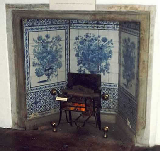 The fireplace in the gallery is decorated with a tile panel showing ‘The Last Supper' (3) painted in purple together with a selection of different tiles showing children's games, landscapes, biblical scenes, and animals executed in blue.
