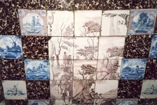 A second fireplace on the second floor shows a panel in purple depicting a scene from the Old Testament in which Joseph (4) (5) is sold by his brothers. This is surrounded by tortoiseshell tiles and tiles showing landscapes and bits of left over tile panels.