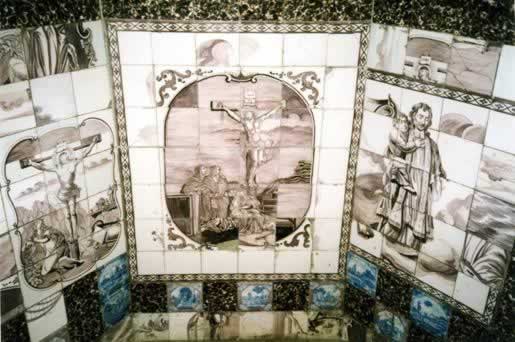 A third fireplace on the second floor has three religious tile panels painted in purple. Two show crucifixion 6) scenes while a third panel depicts a man carrying a child which I have managed to identify as representing S. Vincent de Paule 7) 8) (c. 1580-1660), a French priest who devoted his life to charitable work by ministering to galley slaves, poor people and abandoned children.